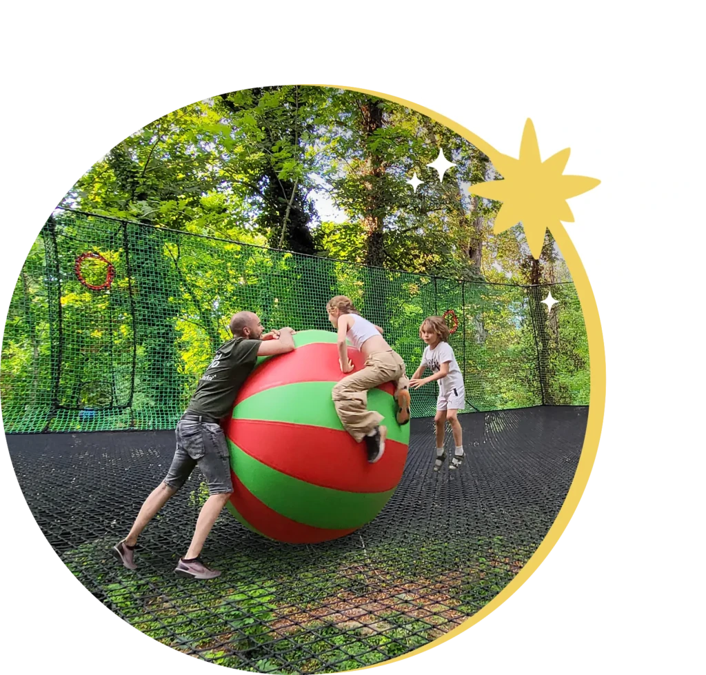 – 120m² de filets suspendus : trampoline géant, balles géantes et espace détente dans les arbres.